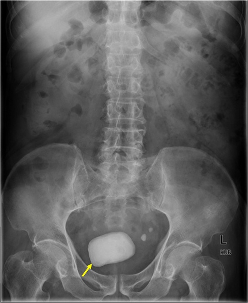 這也是位於膀胱的結石,同時有好多顆石頭。(這張片子亦有典型的乙狀結腸扭結sigmoid volvulus)