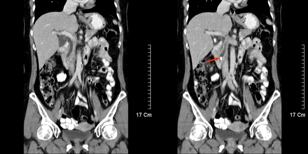石頭出現在總膽管時,可能導致膽管阻塞,患者會出現黃疸。紅色箭頭處的結石,也是皮脆心軟,而且已經造成總膽管脹大。